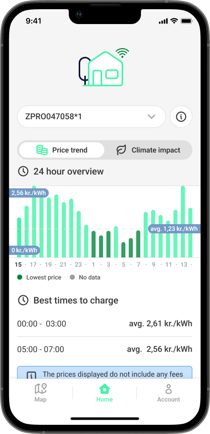 Vores app er nem at bruge i hverdagen. Ønsker du at anvende ladebrik, så kan den nemt tilkobles. Prisen på opladningen fremgår af app'en.